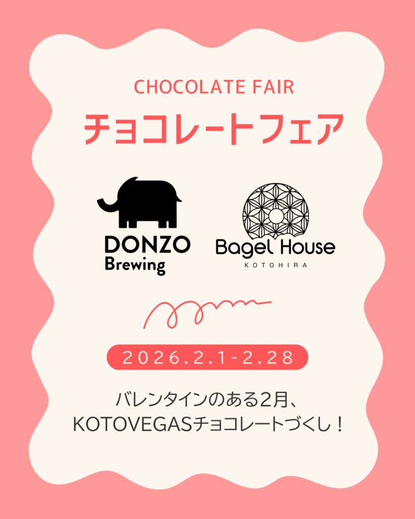 バレンタインを含む2月、香川県琴平町の複合施設KOTOVEGAS系列店ではチョコレートをテーマにしたフェアを開催します。